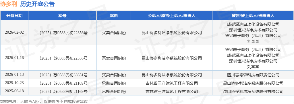 根据统计,近一年内以昆山协多利洁净系统股份有限公司为当事人的历史开庭公告有5则,其中案由为“买卖合同纠纷”的公告以3则居首,其次为“承揽合同纠纷”有2则。历史开庭公告如下: