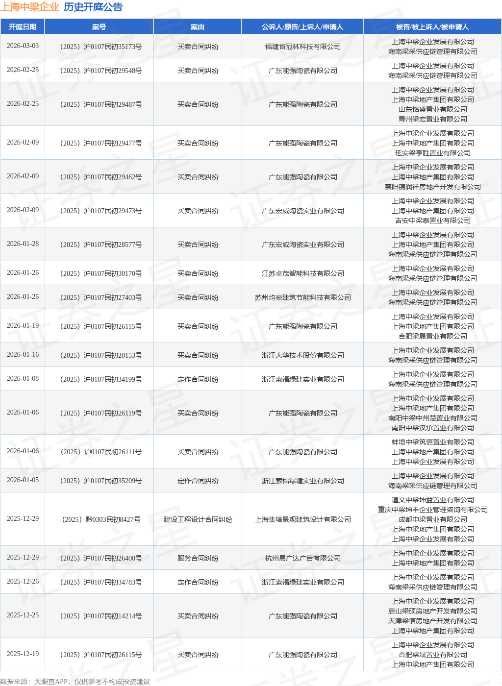 案号:(2025)沪0107民初20153号根据统计,近一年内以上海中梁企业发展有限公司为当事人的历史开庭公告有54则,其中案由为“买卖合同纠纷”的公告以26则居首,其次为“建设工程施工合同纠纷”有9则,“定作合同纠纷”有5则。历史开庭公告(前20条)如下:
