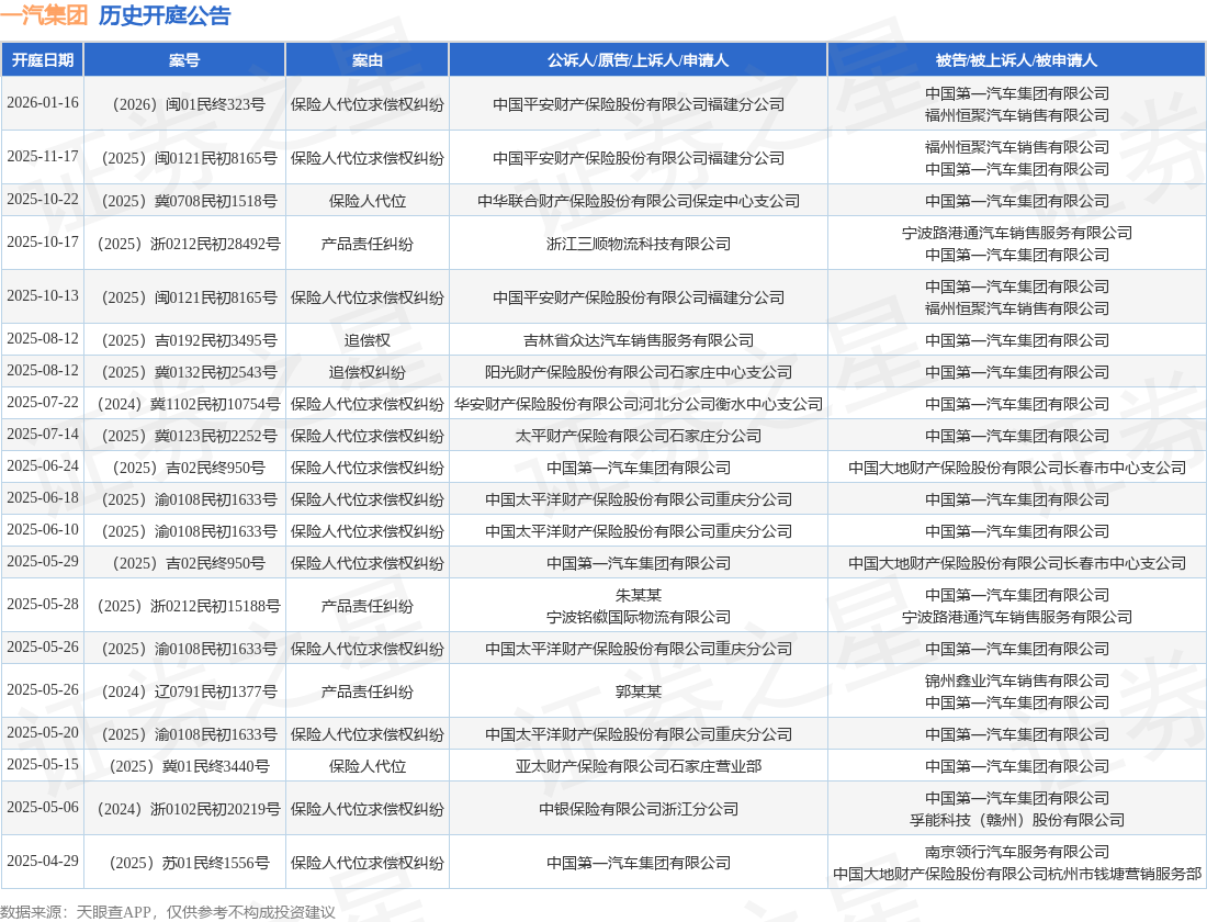 案号:(2026)闽01民终323号根据统计,近一年内以中国第一汽车集团有限公司为当事人的历史开庭公告有29则,其中案由为“保险人代位求偿权纠纷”的公告以16则居首,其次为“产品责任纠纷”有6则,“买卖合同纠纷”有3则。历史开庭公告(前20条)如下: