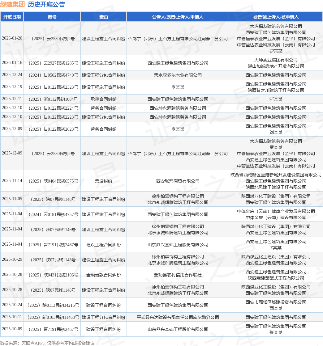 案号:(2025)云2927民初1285号根据统计,近一年内以西安建工绿色建筑集团有限公司为当事人的历史开庭公告有83则,其中案由为“建设工程施工合同纠纷”的公告以23则居首,其次为“买卖合同纠纷”有19则,“建设工程分包合同纠纷”有7则。历史开庭公告(前20条)如下: