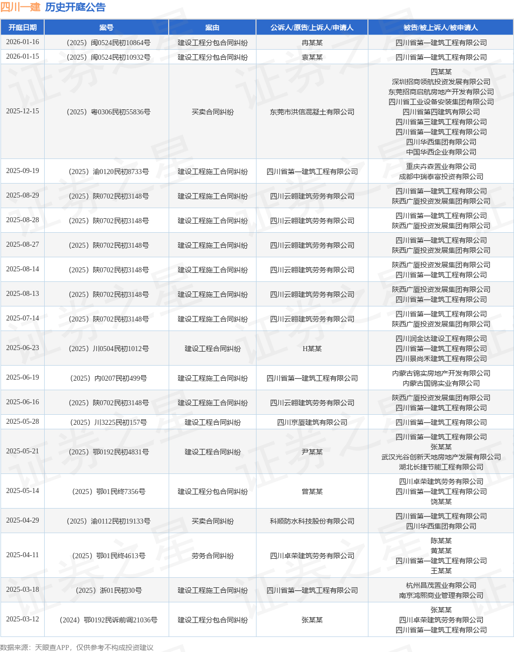 案号:(2025)闽0524民初10864号根据统计,近一年内以四川省第一建筑工程有限公司为当事人的历史开庭公告有43则,其中案由为“建设工程分包合同纠纷”的公告以10则居首,其次为“建设工程施工合同纠纷”有10则,“建设工程合同纠纷”有6则。历史开庭公告(前20条)如下: