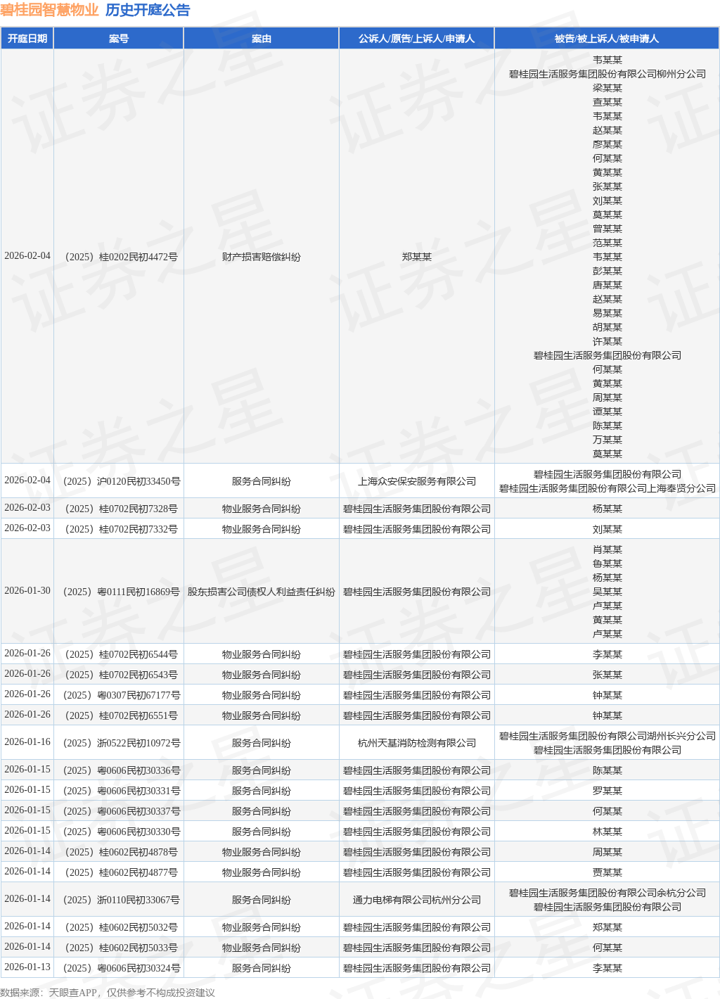案号:(2025)浙0522民初10972号根据统计,近一年内以碧桂园生活服务集团股份有限公司为当事人的历史开庭公告有50则,其中案由为“物业服务合同纠纷”的公告以23则居首,其次为“服务合同纠纷”有17则,“合同纠纷”有2则。历史开庭公告(前20条)如下:
