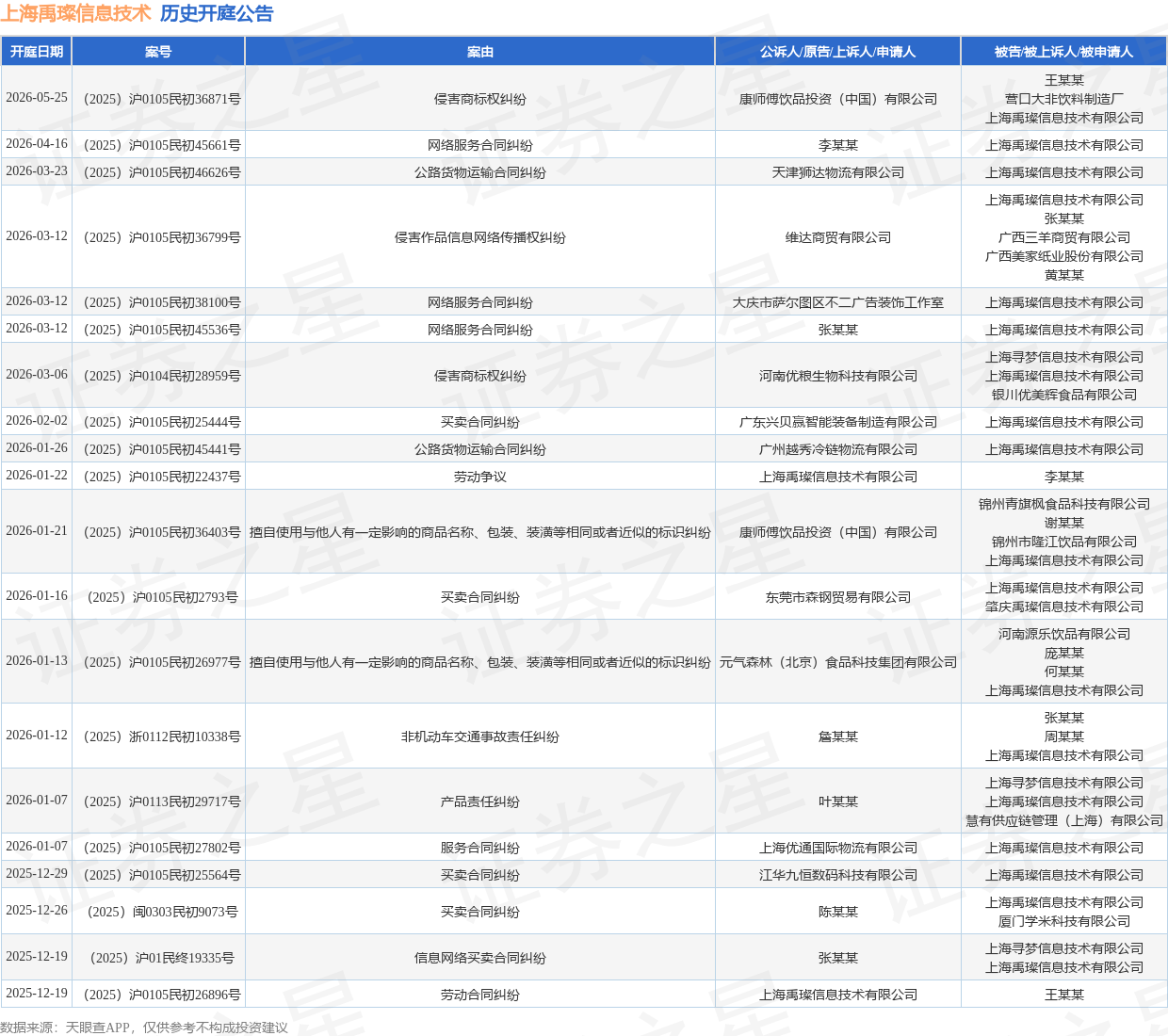 案号:(2025)沪0105民初2793号根据统计,近一年内以上海禹璨信息技术有限公司为当事人的历史开庭公告有177则,其中案由为“网络服务合同纠纷”的公告以68则居首,其次为“侵害商标权纠纷”有18则,“买卖合同纠纷”有14则。历史开庭公告(前20条)如下: