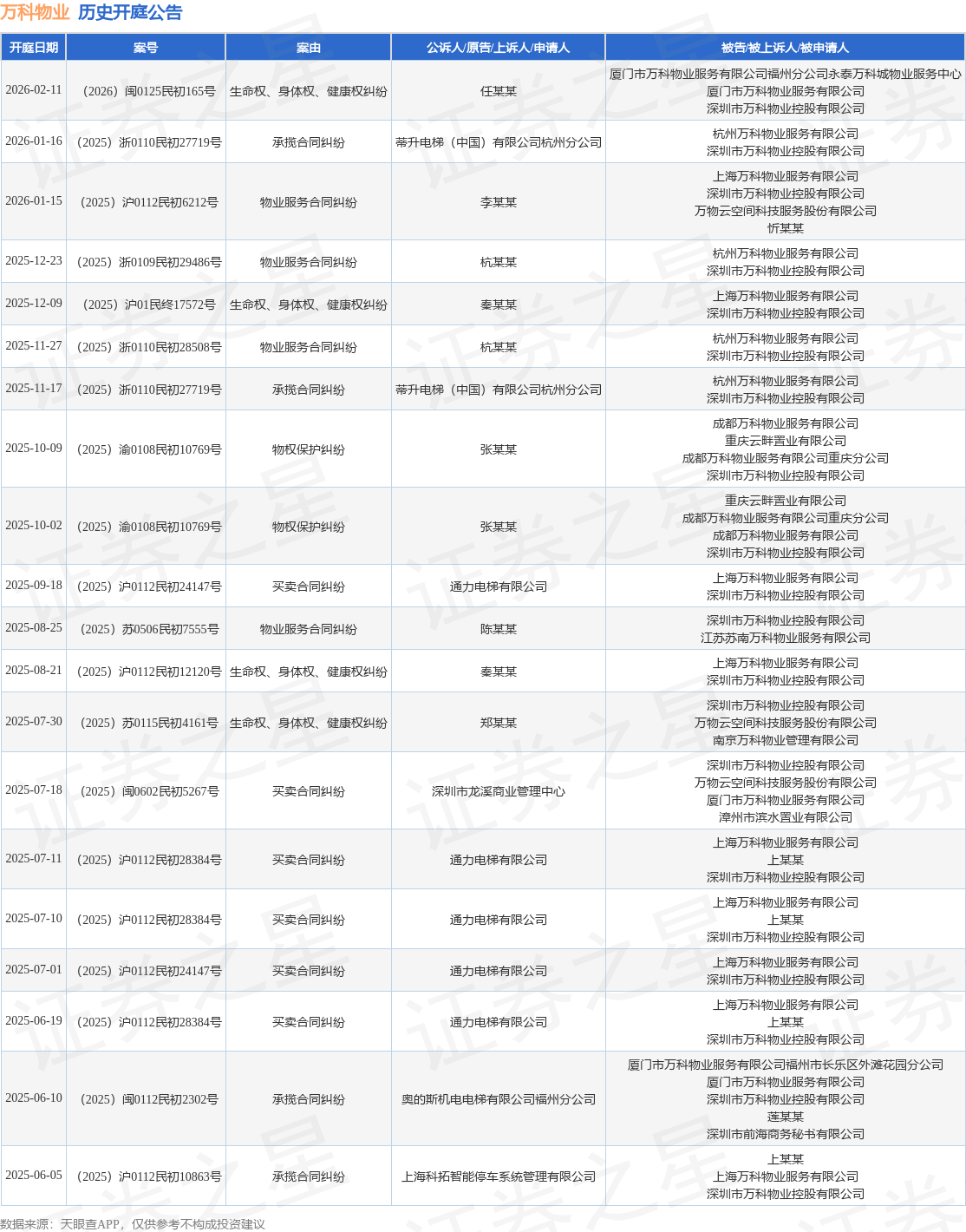 案号:(2025)浙0110民初27719号根据统计,近一年内以深圳市万科物业控股有限公司为当事人的历史开庭公告有29则,其中案由为“买卖合同纠纷”的公告以8则居首,其次为“物业服务合同纠纷”有5则,“生命权、身体权、健康权纠纷”有5则。历史开庭公告(前20条)如下: