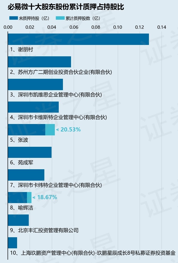 截止本公告日,股东张波已累计质押股份88.0万股,占其持股总数的20.53%,股东喻辉洁已累计质押股份40.0万股,占其持股总数的18.67%。本次质押后必易微十大股东的累计质押股份占持股比例(占持股比例的计算以公司最新一期财务报表公布的十大股东的持股总数为基准)见下图: