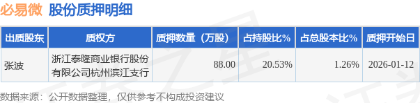 证券之星消息,必易微(688045)1月14日公开信息显示,股东张波向浙江泰隆商业银行股份有限公司杭州滨江支行合计质押88.0万股,占总股本1.26%。质押详情见下表: