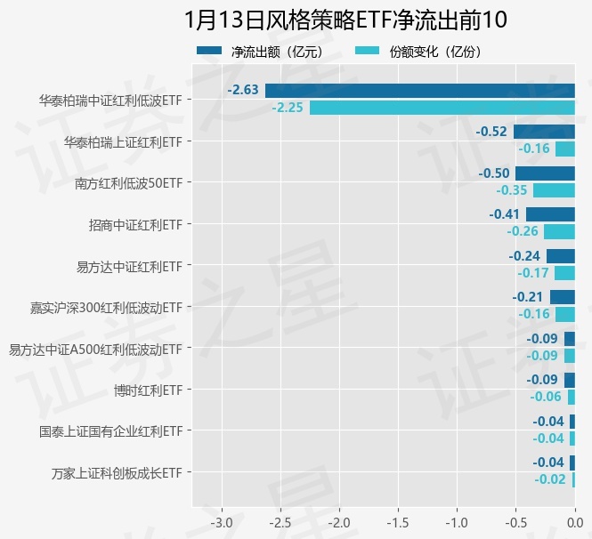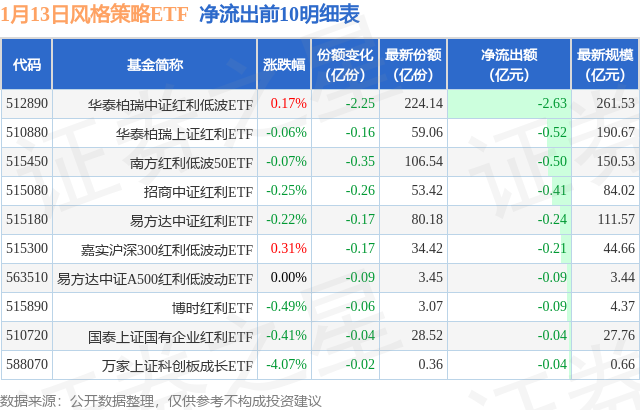 当日有20只风格策略ETF基金出现资金净流出,其中净流出排首位的是华泰柏瑞中证红利低波ETF(512890),份额减少了2.25亿份,净流出额为2.63亿元。
