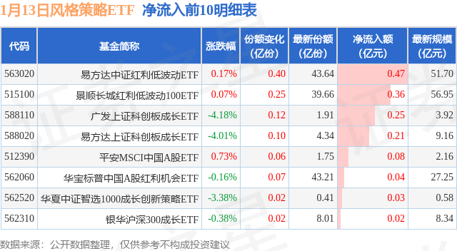 当日有8只风格策略ETF基金出现资金净流入,其中净流入排首位的是易方达中证红利低波动ETF(563020),份额增加了4000.0万份,净流入额为4748.31万元。
