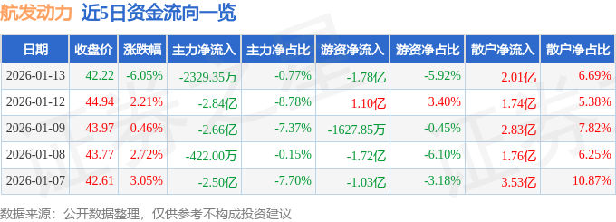 证券之星消息,截至2026年1月13日收盘,航发动力(600893)报收于42.22元,下跌6.05%,换手率2.64%,成交量70.45万手,成交额30.06亿元。