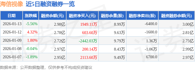 证券之星消息,截至2026年1月13日收盘,海信视像(600060)报收于23.94元,下跌5.56%,换手率1.72%,成交量22.3万手,成交额5.45亿元。