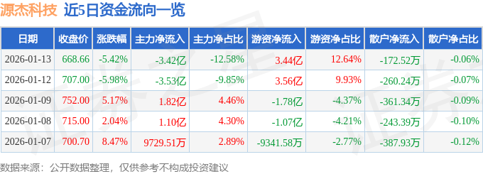 证券之星消息,截至2026年1月13日收盘,源杰科技(688498)报收于668.66元,下跌5.42%,换手率4.74%,成交量3.98万手,成交额27.2亿元。