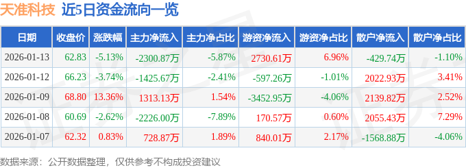 证券之星消息,截至2026年1月13日收盘,天准科技(688003)报收于62.83元,下跌5.13%,换手率3.17%,成交量6.17万手,成交额3.92亿元。