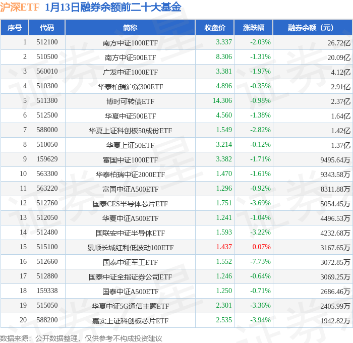 沪深ETF融券余额前三分别为:南方中证1000ETF(512100)融券余额26.72亿元、南方中证500ETF(510500)融券余额20.09亿元、广发中证1000ETF(560010)融券余额4.12亿元,前20具体见下表: