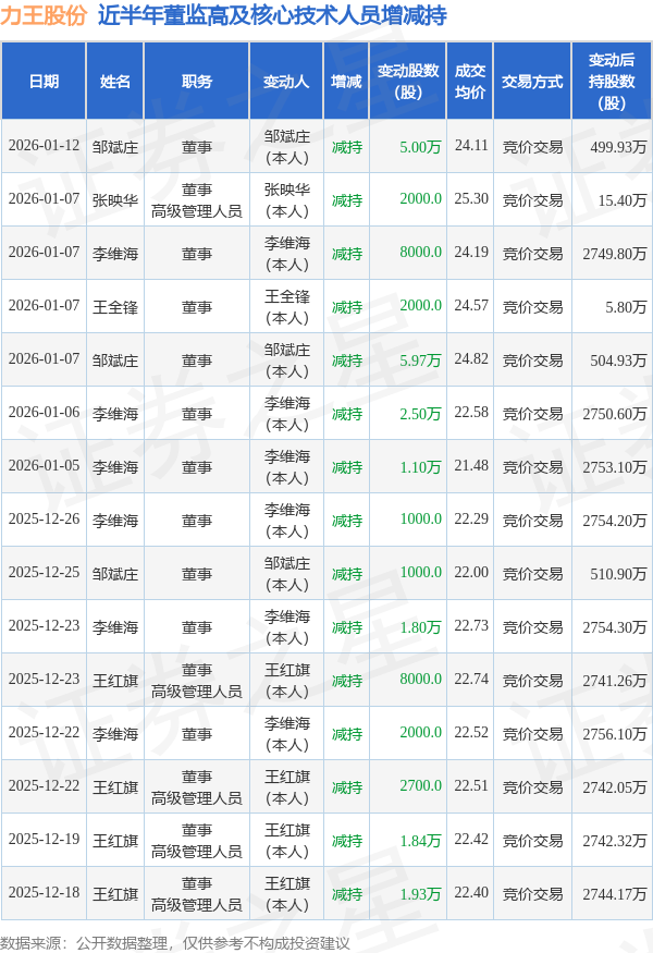 力王股份近半年内的董监高及核心技术人员增减持详情如下: