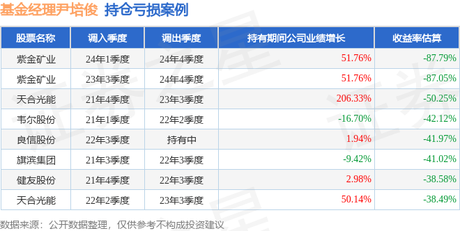 尹培俊管理的华富安享债券A基金在24年1季度买入紫金矿业,在持有3个季度后在24年4季度卖出。持有期间的估算收益率为-87.79%,持有期间紫金矿业在2023年到2024年的年报归属净利润增幅达51.76%。