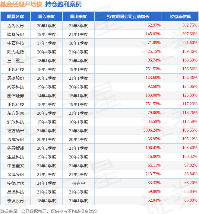 尹培俊管理的华富安享债券A基金在20年1季度买入迈为股份,在持有1年又2个季度后在21年3季度卖出。持有期间的估算收益率为502.75%,持有期间迈为股份在2020年到2021年的年报归属净利润增幅达62.97%。