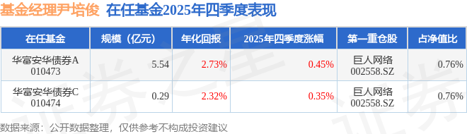 证券之星消息,截止2025年四季度末,基金经理尹培俊旗下共管理2只基金,本季度表现最佳的为华富安华债券A(010473),季度净值涨0.45%。