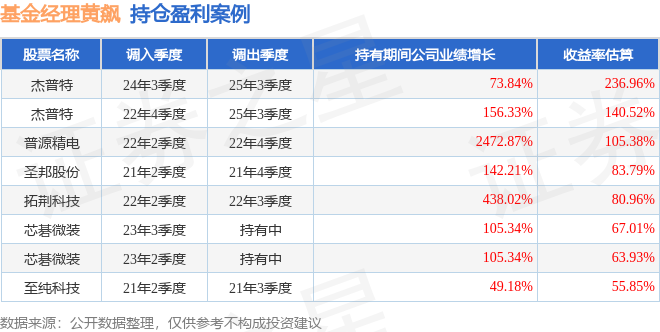 黄飙管理的金信优质成长混合A基金在24年3季度买入杰普特,在持有1年又0个季度后在25年3季度卖出。持有期间的估算收益率为236.96%,持有期间杰普特在2024年到2025年的中报归属净利润增幅达73.84%。