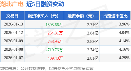 证券之星消息,1月13日,湖北广电(000665)融资买入4296.12万元,融资偿还5599.79万元,融资净卖出1303.66万元,融资余额2.71亿元。