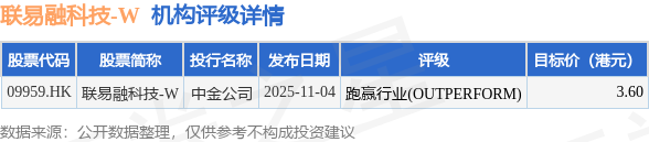 投行对该股的评级以跑赢行业(OUTPERFORM)为主,近90天内共有1家投行给出跑赢行业(OUTPERFORM)评级,近90天的目标均价为3.6港元。中金公司最新一份研报给予联易融科技-W跑赢行业(OUTPERFORM)评级,目标价3.6港元。