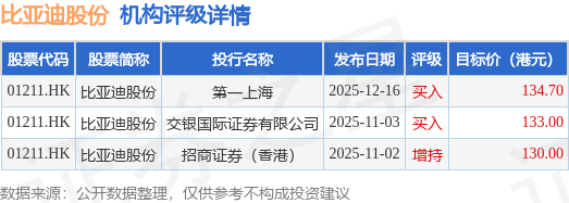 投行对该股的评级以买入为主,近90天内共有2家投行给出买入评级,近90天的目标均价为132.57港元。第一上海最新一份研报给予比亚迪股份买入评级,目标价134.7港元。