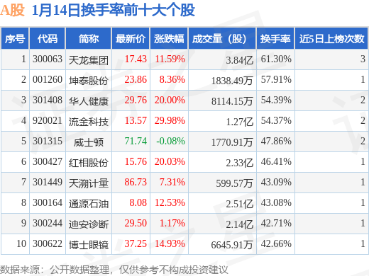 当日A股换手率前10大个股中9只个股收涨,平均涨幅13.99%,其中天龙集团(300063)以换手率61.3%排第一,4只个股近5个交易日中多次上榜。
