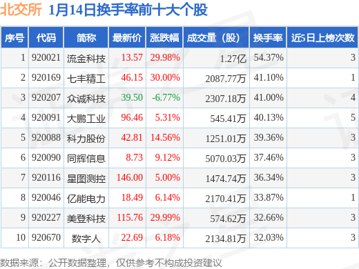 当日北交所换手率前10大个股中9只个股收涨,平均涨幅15.14%,其中流金科技(920021)以换手率54.37%排第一,8只个股近5个交易日中多次上榜。