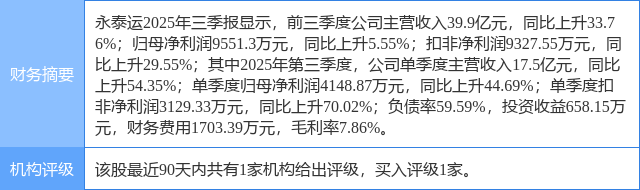 2025年10月29日,国金证券研究员郑树明,王凯婕,霍泽嘉发布了对永泰运的研报《Q3业绩大幅增长 派发前三季度分红》,该研报对永泰运给出“买入”评级。证券之星数据中心根据近三年发布的研报数据计算,该研报作者对此股的盈利预测准确度为27.68%。