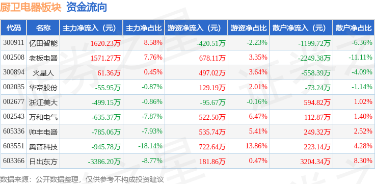 从资金流向上来看,当日厨卫电器板块主力资金净流出3054.64万元,游资资金净流入2750.88万元,散户资金净流入303.76万元。厨卫电器板块个股资金流向见下表:
