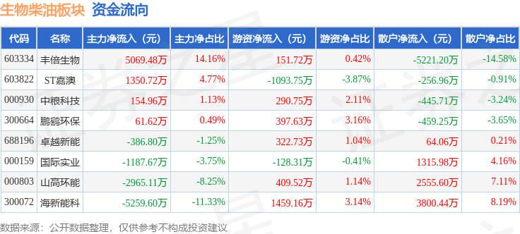 从资金流向上来看,当日生物柴油板块主力资金净流出3162.4万元,游资资金净流入1809.45万元,散户资金净流入1352.95万元。生物柴油板块个股资金流向见下表: