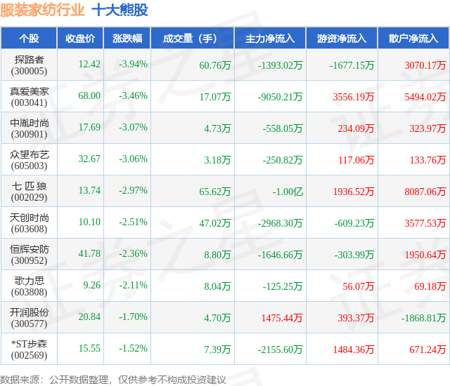 个股表现方面,服装家纺行业当日领跌股为探路者(300005),该股当日报收12.42,下跌3.94%,成交量60.76万,主力资金净流出1393.02万元。真爱美家(003041)以下跌3.46%紧随其后,该股当日成交量17.07万,主力资金净流出9050.21万元。除此之外,中胤时尚(300901)、众望布艺(605003)、七 匹 狼(002029)均进入当日熊股之列。具体个股列表见下表: