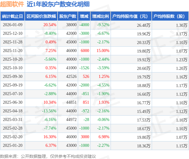 从股价来看,2025年12月19日至2026年1月9日,超图软件区间涨幅为20.54%,在此期间股东户数减少4000.0户,减幅为9.52%。