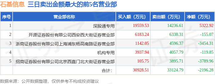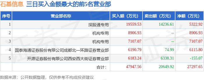 证券小知识:龙虎榜是交易所披露的竞价交易公开信息,现身龙虎榜的个股都是当日最为活跃的个股,是投资者日常重点关注的数据。交易所公布当日买入金额和卖出金额前五名的席位,其中一些席位代表特殊意义,如机构专用席位是指基金专用席位、券商自营专用席位、社保专用席位、券商理财专用席位、保险机构专用席位、保险机构租用席位、QFII专用席位等机构投资者买卖证券的专用通道和席位。深股通专用、沪股通专用为北向资金的交易席位。从龙虎榜数据可以发现和研究机构、游资和散户的资金动向。一些营业部席位经常上榜,市场知名度较高,投资者整理代表散户、游资、量化等不同资金的营业部席位。