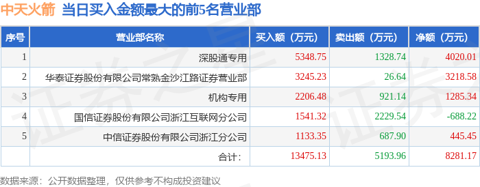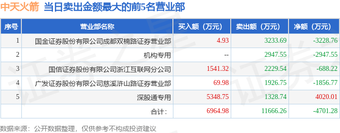 证券之星消息,沪深交易所2026年1月14日公布的交易公开信息显示,中天火箭(003009)因日跌幅偏离值达到7%的前5只证券登上龙虎榜。此次是近5个交易日内第1次上榜。