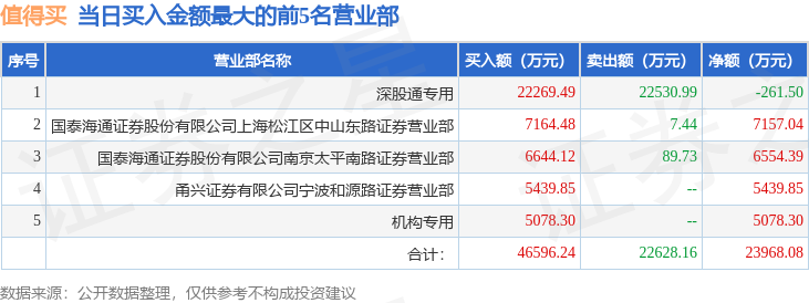 从龙虎榜公布的当日买卖数据来看,机构合计净买入885.86万元,北向资金合计净卖出261.5万元。上海中山东路、作手新一等知名游资榜上有名。(知名游资上海中山东路一般指国泰海通证券股份有限公司上海松江区中山东路证券营业部席位、知名游资作手新一一般指国泰海通证券股份有限公司南京太平南路证券营业部席位,根据市场资料整理,仅供参考)