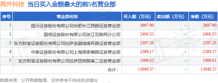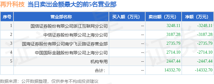 证券之星消息,沪深交易所2026年1月14日公布的交易公开信息显示,再升科技(603601)因有价格涨跌幅限制的日收盘价格跌幅偏离值达到7%的前五只证券登上龙虎榜。此次是近5个交易日内第2次上榜。