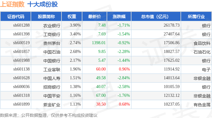 上证指数(000001)十大成份股详情如下: