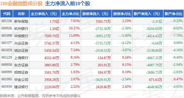 资金流向方面,180金融(000018)指数成份股当日主力资金净流出合计65.27亿元,游资资金净流入合计39.79亿元,散户资金净流入合计25.48亿元。成份股资金流向详情见下表: