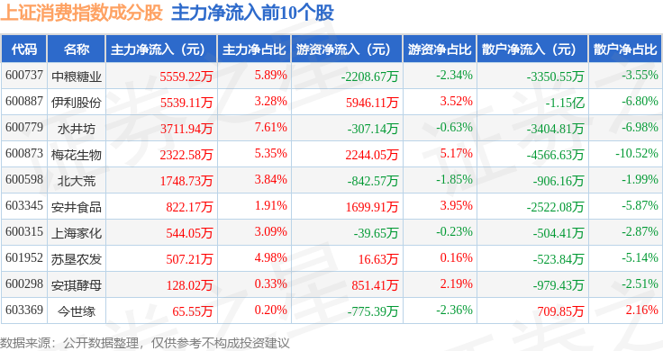 资金流向方面,上证消费(000036)指数成份股当日主力资金净流出合计8.69亿元,游资资金净流入合计7.25亿元,散户资金净流入合计1.44亿元。成份股资金流向详情见下表: