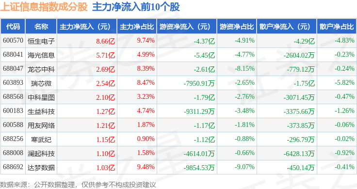 资金流向方面,上证信息(000039)指数成份股当日主力资金净流出合计9.72亿元,游资资金净流出合计12.68亿元,散户资金净流入合计22.4亿元。成份股资金流向详情见下表:
