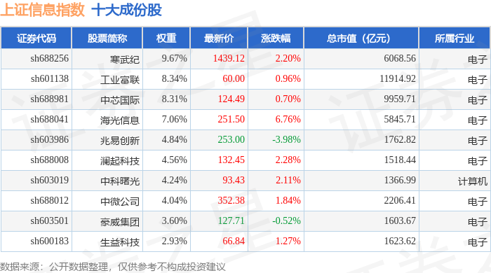 上证信息(000039)指数十大成份股详情如下:
