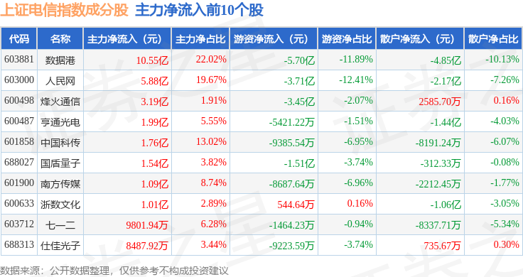 资金流向方面,上证电信(000040)指数成份股当日主力资金净流入合计4.78亿元,游资资金净流出合计11.75亿元,散户资金净流入合计6.97亿元。成份股资金流向详情见下表: