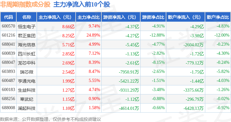 资金流向方面,非周期(000064)指数成份股当日主力资金净流出合计160.1亿元,游资资金净流入合计43.4亿元,散户资金净流入合计116.7亿元。成份股资金流向详情见下表: