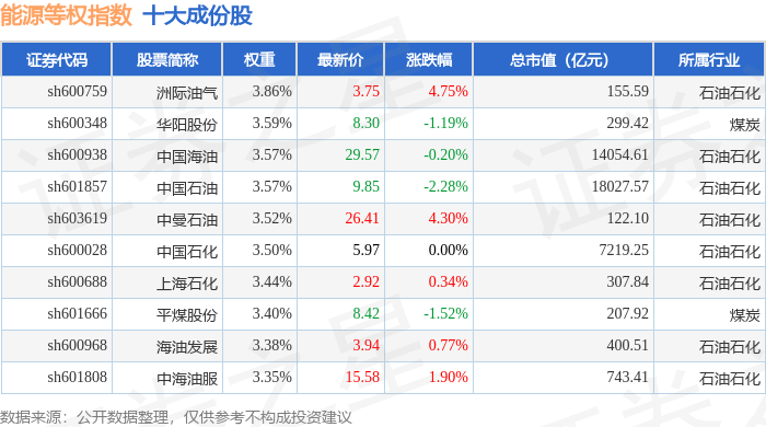 证券之星消息,1月14日,能源等权(000070)指数报收于2737.89点,跌0.03%,成交211.79亿元,换手率0.77%。当日该指数成份股中,上涨的有9家,洲际油气以4.75%的涨幅领涨,下跌的有20家,中国石油以2.28%的跌幅领跌。