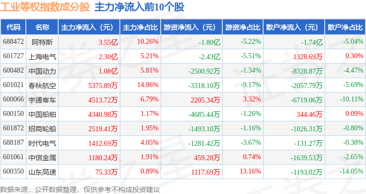 资金流向方面,工业等权(000072)指数成份股当日主力资金净流出合计87.55亿元,游资资金净流入合计28.86亿元,散户资金净流入合计58.68亿元。成份股资金流向详情见下表: