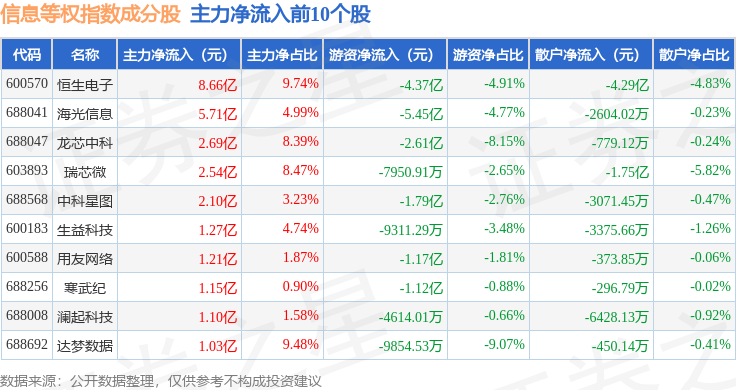 资金流向方面,信息等权(000077)指数成份股当日主力资金净流出合计9.72亿元,游资资金净流出合计12.68亿元,散户资金净流入合计22.4亿元。成份股资金流向详情见下表: