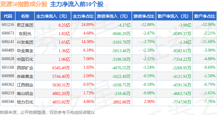 资金流向方面,资源50(000092)指数成份股当日主力资金净流出合计35.42亿元,游资资金净流入合计11.58亿元,散户资金净流入合计23.85亿元。成份股资金流向详情见下表: