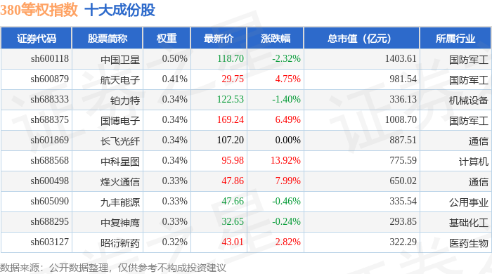 380等权(000115)指数十大成份股详情如下: