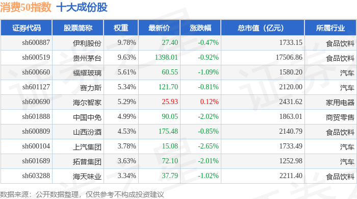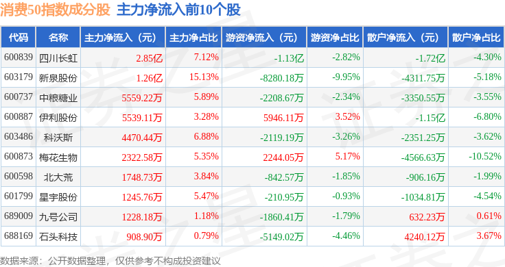 资金流向方面,消费50(000126)指数成份股当日主力资金净流出合计38.54亿元,游资资金净流入合计11.9亿元,散户资金净流入合计26.64亿元。成份股资金流向详情见下表: