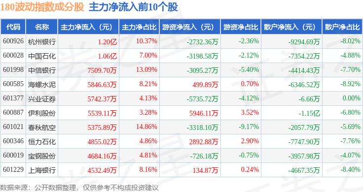 资金流向方面,180波动(000129)指数成份股当日主力资金净流出合计148.78亿元,游资资金净流入合计84.61亿元,散户资金净流入合计64.17亿元。成份股资金流向详情见下表: